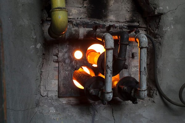 В большой банной печи, которую топят газом, труба остывает несколько дней, для этого нужно закрывать заведение, что невыгодно администрации. Поэтому в Измайловских общественных банях (на снимке) трубу чистят, когда она горячая. Трубочист опускает ерш с грузом и веревкой в ведро с водой, прочищает канал и снова охлаждает их в воде.