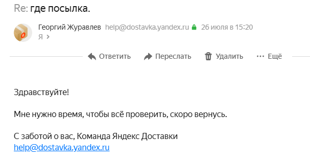 Казалось бы круто, так быстро приедет. Только скрины сделаны 25.07. В чате тех поддержка отвечает спустя сутки, и в формате "приняли ваше обращение". Большего через чат добиться не удалось. Обращение в поддержку через почту чуть лучше, но тоже не далеко уехало: