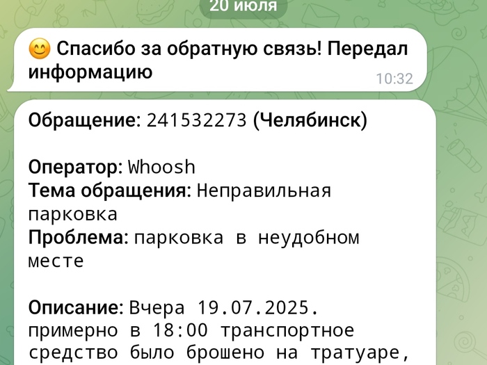 Кстати, на самокат Whoosh брошенный посреди тротуара тоже оставлял жалобу, но пока что тишина