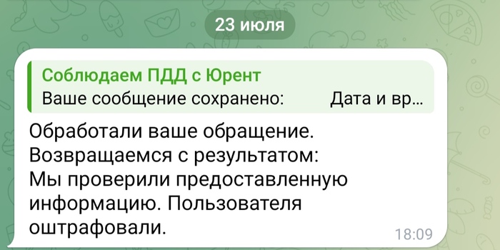 Нахожу бота в телеграмме Соблюдаем ПДД с Юрент и оставил жалобу. С первого раза не вышло: