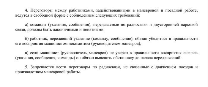 Так вот. Теперь имея представление о солидности ассортимента средств связи вывод напрашивается самостоятельно, что на железной дороге говорят слишком много и по любому поводу. Даже если со стороны кажется, что поезд просто так взял и молча отправился, потому что ему захотелось, то нет. Прежде чем начать движение он должен получить команду от дежурного. Прежде чем дать команду дежурный получает задание от маневрового диспетчера, маневровый диспетчер прежде чем нарезать задачу согласовывает с узловым диспетчером, узловой с поездным... и таким образом может выстроиться довольно длинная цепочка. Или для того чтобы работникам путевого хозяйства начать работу на перегоне для начала нужно их мастеру участка дать заявку ответственному за «окна», ответственный за «окна» должен согласовать это «окно», утверждает, пускает в работу, делопроизводители дают телеграмму на участок, на участке с телеграммой ознакамливается дежурный и диспетчер, принимают решение разрешить или не разрешить во время указанное в заявке чтобы путейцы вкрутили какой-нибудь несчастный болт, стопитсот переговоров между бригадиром и дежурным перед и после закрытия перегона.. (возможны неточности, во вьетнамских флэшбеках вспоминается примерно так)