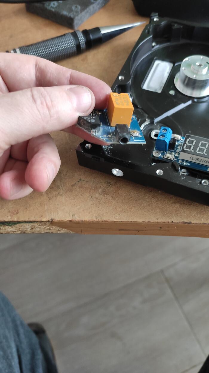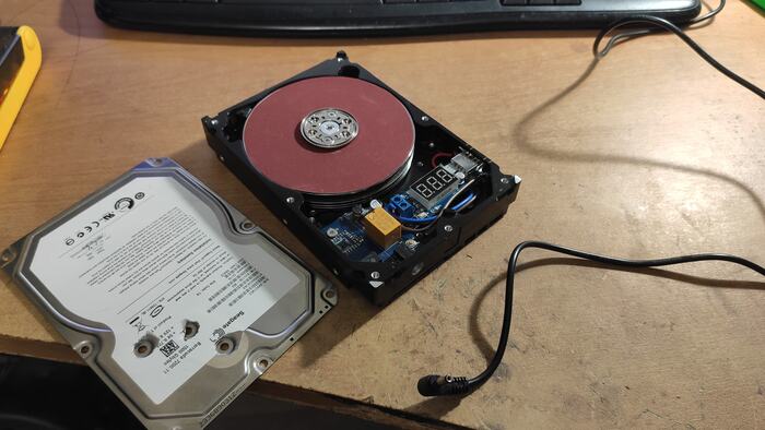 Разобрал диск, снял все лишнее (головки, магниты, начинку). На блины наклеил разные образивы от "нулевки" до "сотки". В корпус вставил контроллер напряжения с ивестного китайского сайта, ЮСБ зарядку (ну это уже просто делать нечего было), просверлил для них два отверстия, одно под штекер питания 12V, другое под разъем USB, надежно закрепил внутри корпуса.