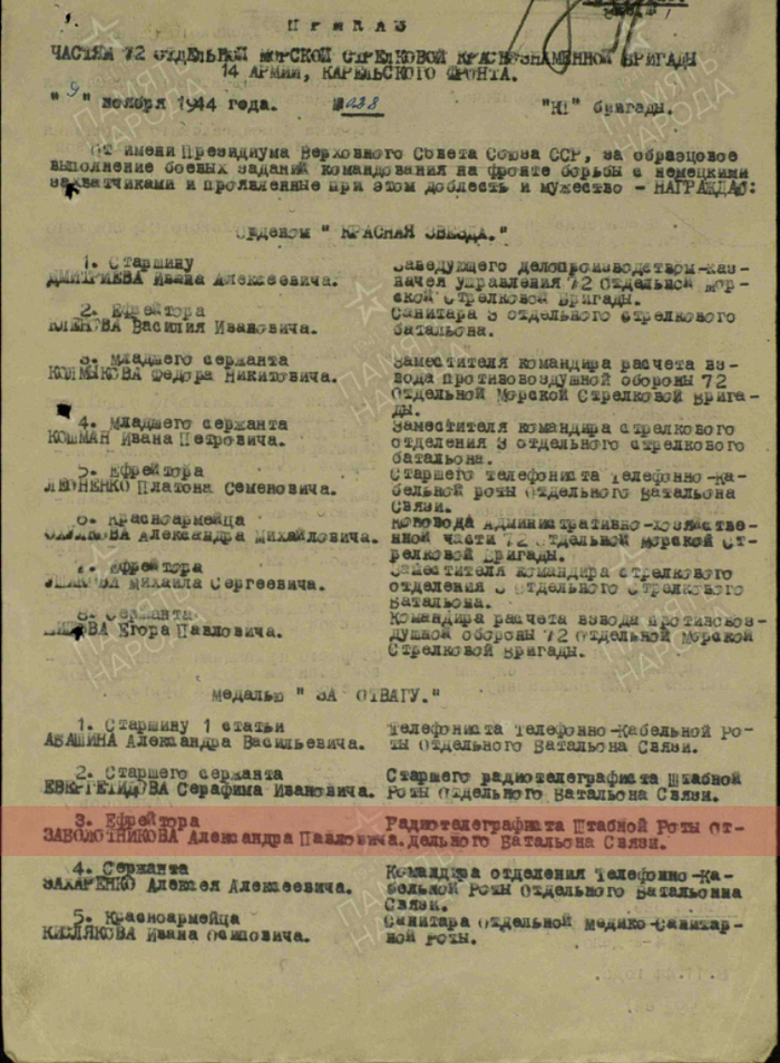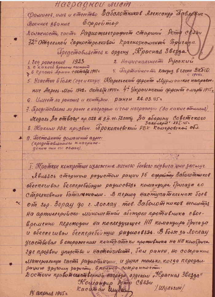 Мой дед Заболотников Александр Павлович. Ушёл на фронт в октябре 1941 года в возрасте 18 лет. Служил радиотелеграфистом штабной роты Отдельного батальона связи 72 Отдельной Морской Стрелковой Бригады в звании ефрейтора. Получил медаль «За Отвагу», 2 Ордена Красной Звезды. Был тяжело ранен. Вернулся с фронта в сентябре 1946 года.