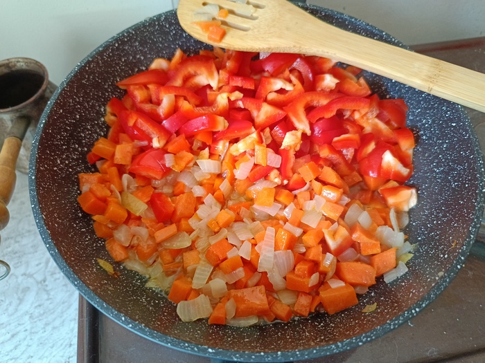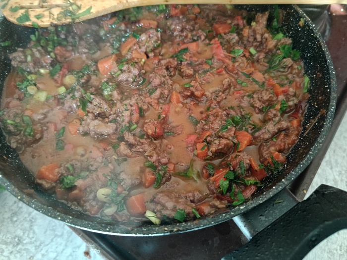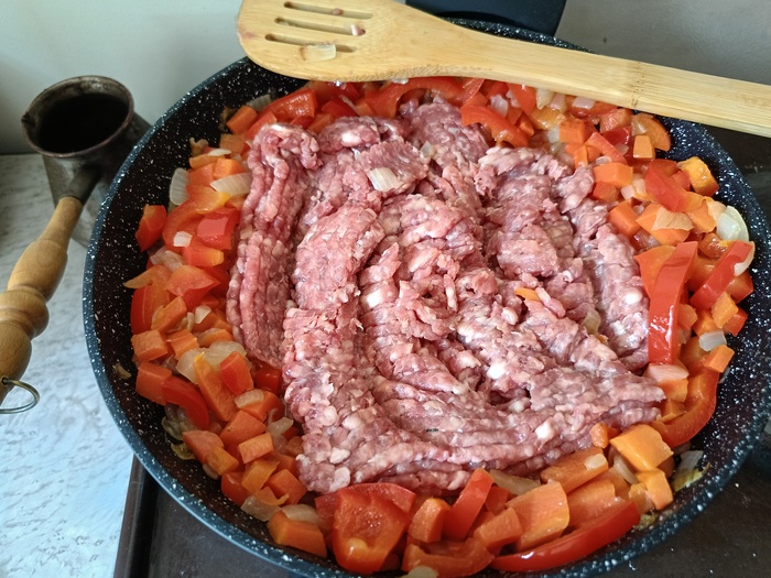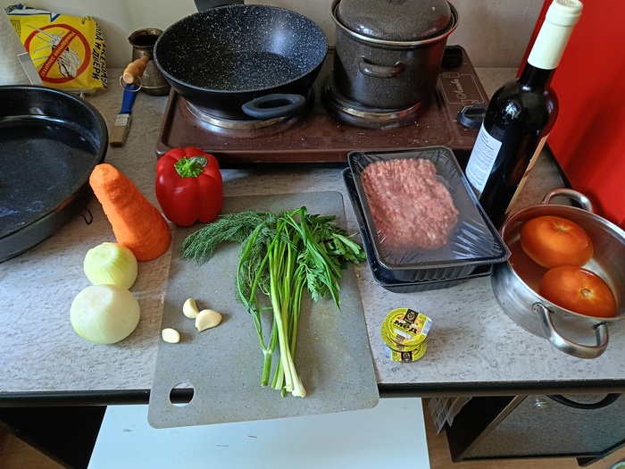 Фарш(50/50 свинина говядина) но кто знает что там). И поверх помидорки пусть греются пока(шкурку снял, как по мне дешевле гораздо. Цель напоминаю дёшево) .