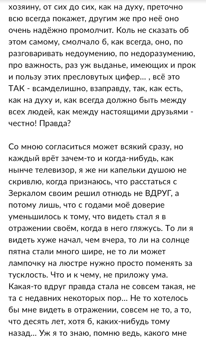 В 20 лет, после разрушения моей искусственной личности, я начала жить абсолютно по инерции. Сейчас мне 25. Я абсолютно не представляю кто я. Я абсолютно не знаю кем я хочу быть. Я не имею никакой мотивации, кроме денег. Практически все начинания я бросаю. Я не умею жить. У меня апатия и огромное количество лени. Я не умею общаться с людьми (вероятно, это вследствие жесткой травли в школе). Саму себя я интерпретирую примерно как какое то желе, что то бесформенное и неопределенное. Я не знаю как я хочу одеваться. Я не чувствую свои границы. Я даже не уверена какая музыка мне в самом деле нравится, или я слушаю ее потому что она популярна. Большинство моих поступков я совершаю в зависимости от настроения. А настроение в 70% случаев зависит от погоды. Я ничего не делаю на "отлично" и "хорошо".