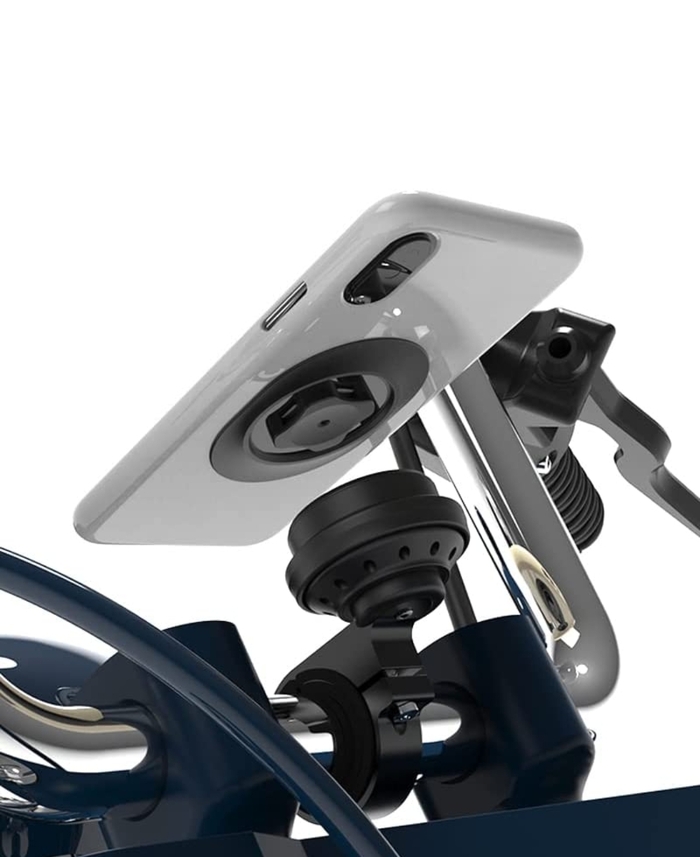 Имеет много разных вариаций крепления непосредственно к рулю/выносу и адаптер для крепления к телефону/чехлу. Адаптер намертво клеится 3М клеем к поверхности чехла/телефона. На личном опыте несколько раз проверил надёжность, когда учился ездить с контактами - при падении телефон остался в креплении во всех случаях.