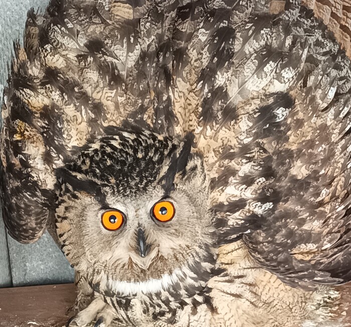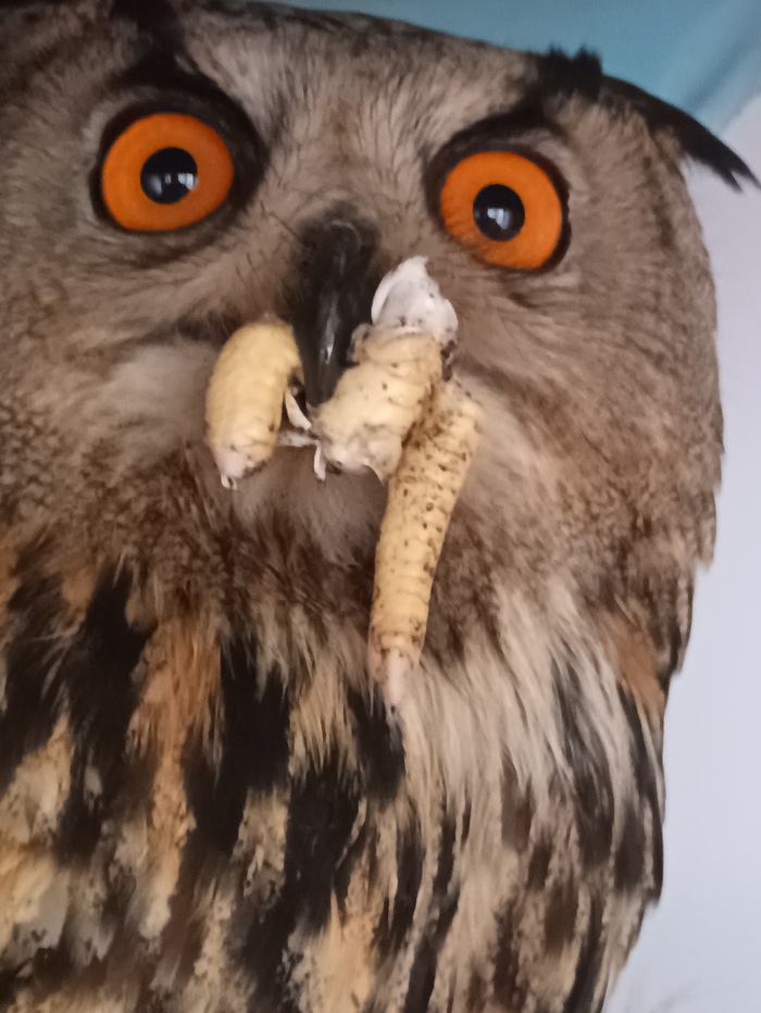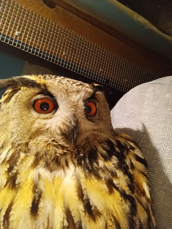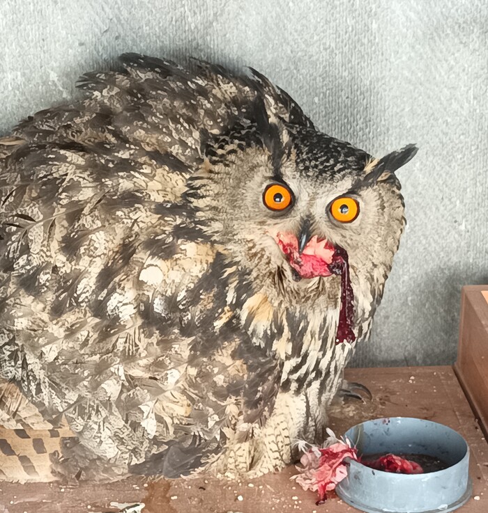 В общем,кушает очень хорошо и много,на собак и кошек шипит и щелкает клювом)))днём сидит в вольере собачьем пустом,на ночь в куриный брудер пересаживаем,т.к. в темноте активизируется,и по стенам лазит.левое крыло зажило,а на правом дырка медленно затягивается.выпускать ещё рановато, вдруг не сможет летать с раной,понянчим ещё)