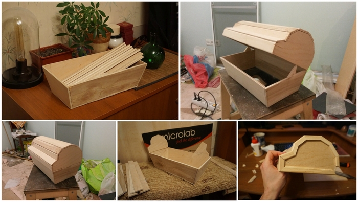 Короче как мог подогнал деревяхи. Листы фанеры 5мм толщиной. Не картон, но и не бронебойная. Однако, как почти любая фанера, все равно изрядно кривая. Когда стал совмещать крышку и ящик, сундук выглядел перекошенным, как выбитая челюсть. В процессе удалось его выровнять, но я списываю это чисто на везение. Склеивать продольные и поперечные рейки оказалась та еще жопа. Потребовалось 5 струбцин, чтобы все это нормально схватилось без щелей. А в некоторых местах стыков не видно и вовсе. Получилось хорошо, не ожидал от себя.