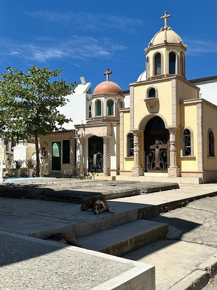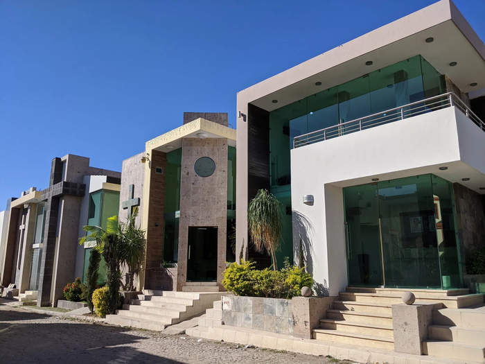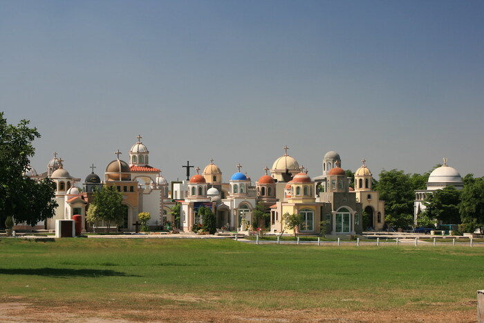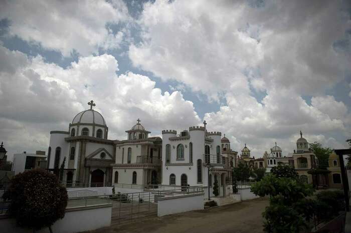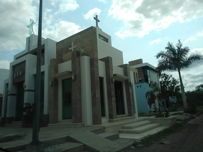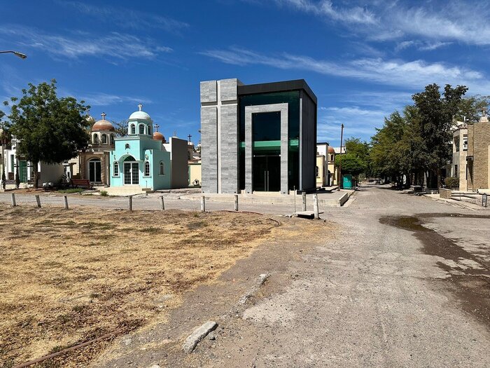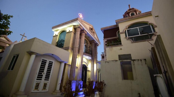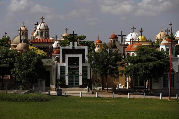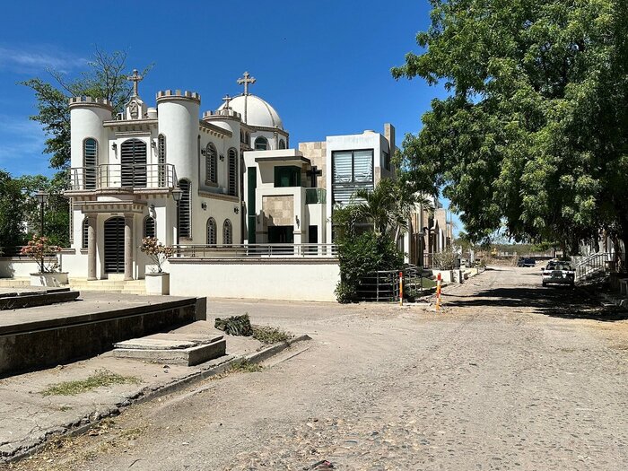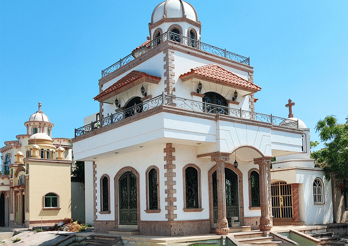 Это не особняки, а мавзолеи на могилах местной братвы из наркокартеля Sinaloa, он же "Тихоокеанский картель".Многие из таких сооружений стоят не один млн долларов, но картель не жалеет денег для своих баронов, павших в борьбе с государством или с конкурентами.