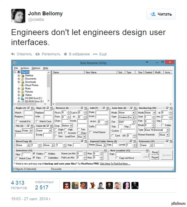 2545 GrandGrego Инженеры 10 лет назад Не давайте инженерам создавать интерфейс для юзеров... Программирование Gui Инженер А вроде все понятно