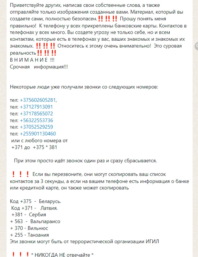 8 GrblmzaT Вместо тысячи просьб 2 года назад ГЕНИАЛЬНО! Спасибо тебе неизвестный тролль, ибо это мне прислала маменька. Больше никаких картинок и видосиков! Но чем теперь наши родственники будут жить? П.С. Про ИГИЛ, наверное, было лишним или это старый текст? Показать полностью 2 [моё] Мошенничество Интернет-мошенники WhatsApp Троллинг Картинка с текстом Длиннопост Ещё 0