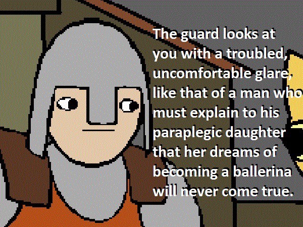 Надпись на иллюстрации: «Страж смотрит на вас озабоченным, вызывающим беспокойство взглядом, как тот мужчина, который должен объяснить своей парализованной дочке, что её мечта стать балериной никогда не осуществится».