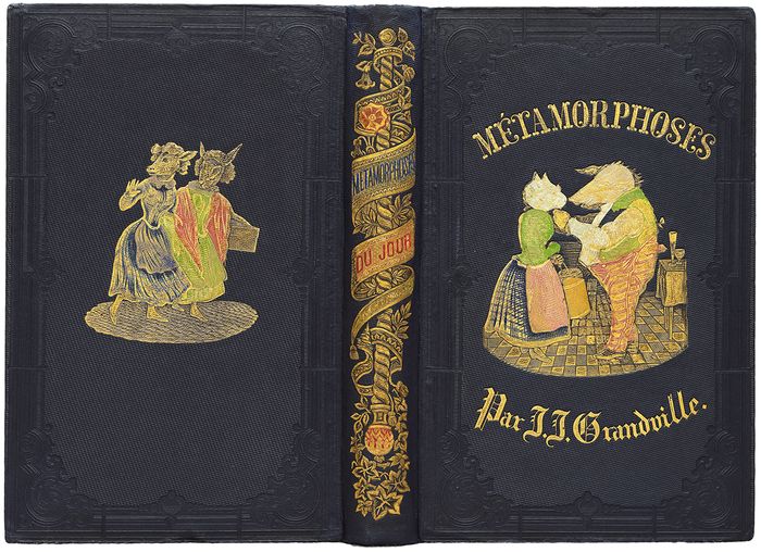 Книга «Les Métamorphoses du jour» (1829) Ж. Ж. Гранвиля — это сатирический альбом из 73 цветных литографий, где люди изображены с головами животных, но с человеческими телами, одеждой и поведением.