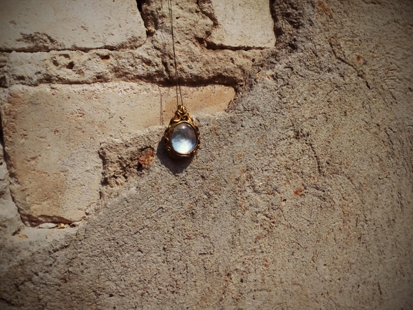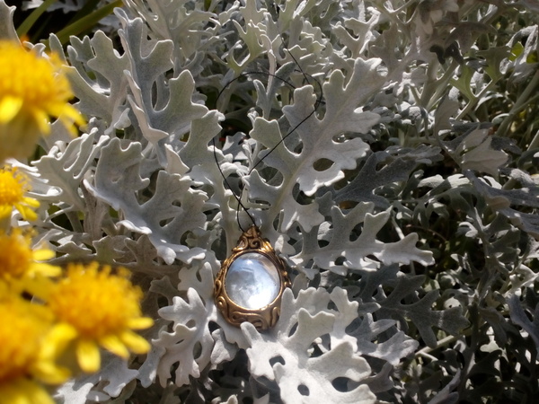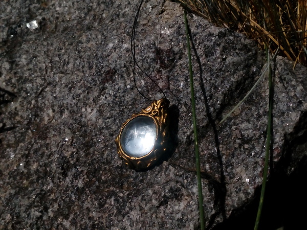 Первый кулон, у нас, в эдакой слегка "змеиной" тематике выполнен с использованием золотой потали. За счет этого и самого камня отлично бликует на солнце, при чем цвет блика зависит от угла обзора и самого освещения, что наглядно видно выше, а также на следующей фотографии.