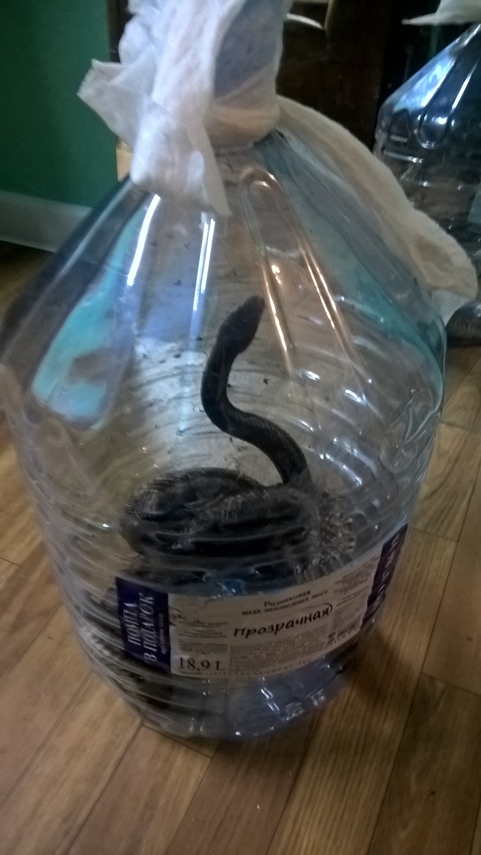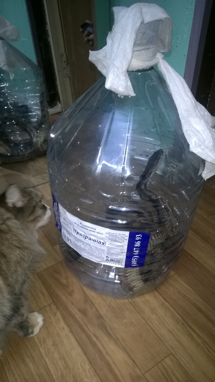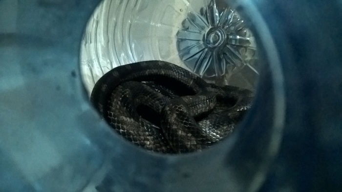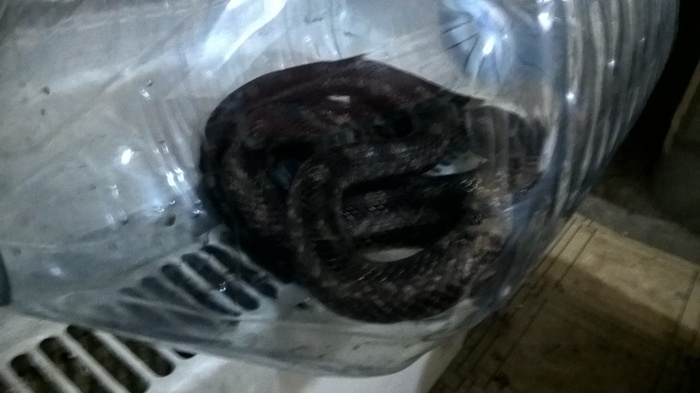 Замотали марлей горлышко чтоб исключить его побег в трубы и смерть соседей. Товарищу позвонили из какойто службы и сказали что через 40 мин прибудут, попутно просили выслать фото змеи. Как оказалось это крысиный полоз, довольно агресивный и буйный. Пришла императрица: