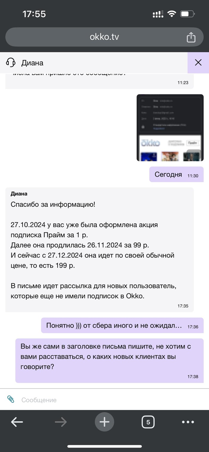 Сегодня прилетает письмо от okko_tv с заголовком "Не хотим с вами расставаться" и текстом "Всего 149 ₽ — и подписка ваша Сохраните доступ к любимым фильмам и сериалам — возвращайтесь в подписку, мы вас ждем! В Прайм входит не только Okko, но и другие преимущества экосистемы Сбера." Подписывался на НГ праздники, подписка закончилась вроде как и не нужна но думаю скидка в 50 руб. надо брать! Захожу на сайт по ссылке в письме а оформить подписку можно только по основному тарифу за 199 руб. и никаких скидок и акций нет. Пишу в поддержку так мол и так, а почему собственно я не могу оформить подписку за 149 рублей, выяснили что за письмо было, когда я его получил, и в итоге оказалось что я уже обобрал бедную контору поскольку 27.10.24г. я купил подписку за 1 руб., 26.11.24г. я продлил подписку за 99 руб. а теперь захотел обобрать бедных людей еще, а они оказывается рассылали эти письма для новых пользователей, которые еще не имели подписки. Только не понятно почему письмо по адресу который у них зарегистрирован и 2 раза была куплена подписка, почему в заголовке письма сказано что они не хотят со мной расставаться, в теле письма говорят о сохранности доступа к любимым фильмам и сериалам. Ну и в итоге мой вопрос пока остался без мотивированного ответа, уже прошел час. Ниже скрины письма и переписки с поддержкой.