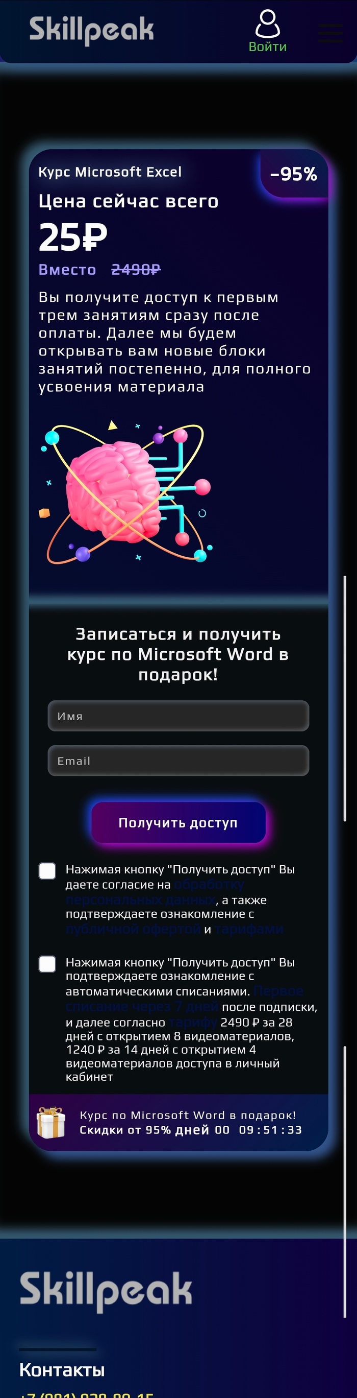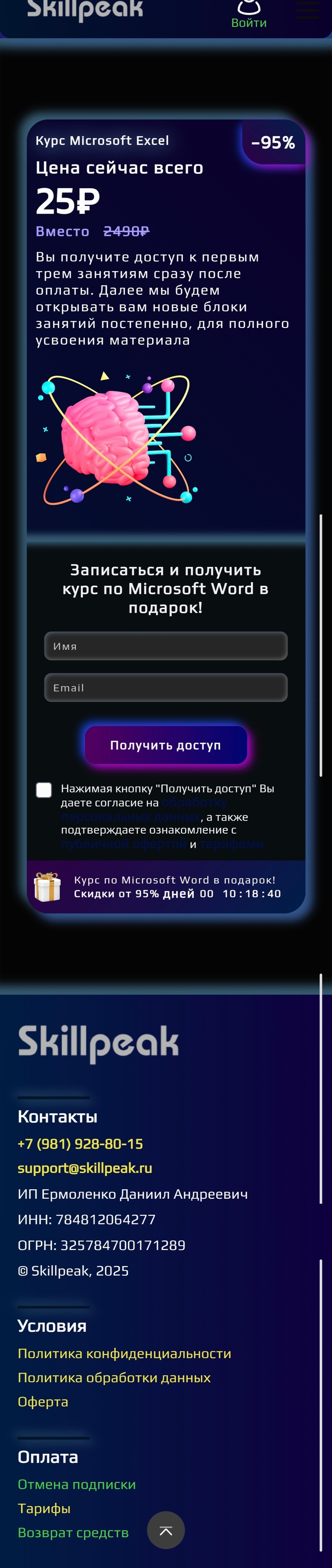 В TikTok я был подписан на канал «Обучение Excel». В шапке профиля обнаружил информацию о акции: курс якобы можно приобрести за 25 рублей вместо 2 490 рублей. Была указана ссылка — я перешёл по ней и попал на сайт skillpeak.ru.