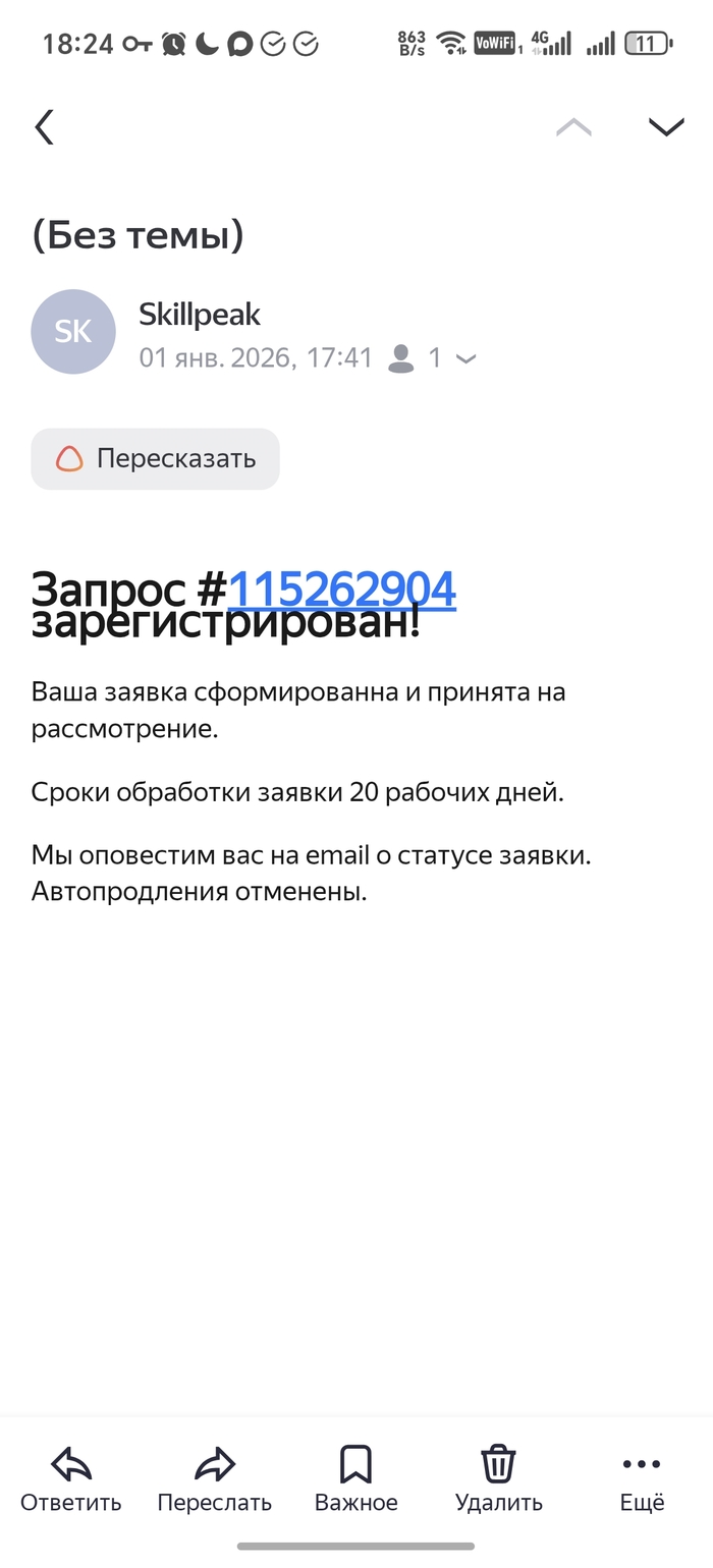 Также обратился к поставщику услуг через форму возврата денег, на email пришло письмо, что подписка отменена. Мне ответили, что рассмотрение займёт до 20 дней — похоже, это способ затянуть время.