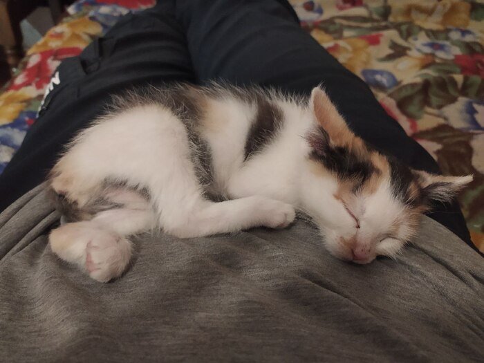 Предыдущий пост про кошку негатива не вызвал, поэтому хочу немного о ней рассказать. Была спасена волонтёрами из подвала, где в возрасте около месяца охрипла от крика и умирала с голода. Я взял её через пару недель, увидел объявление на Авито. Это было голенастое худое существо, с лысым пузом и вечно голодное. Неделю она спала только у меня на животе, видимо чувствуя защиту.