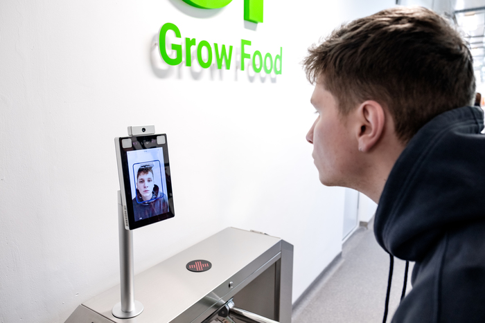 Чтобы попасть на территорию производства, нужно пройти через датчик, который по фотографии или отпечатку руки пропускает внутрь только своих. Он же измеряет температуру.