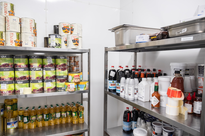 Рядом находится сухой склад. Здесь хранятся консервные банки с томатной пастой, соусы и другие продукты, которые поставляются в Grow Food в заводской упаковке.