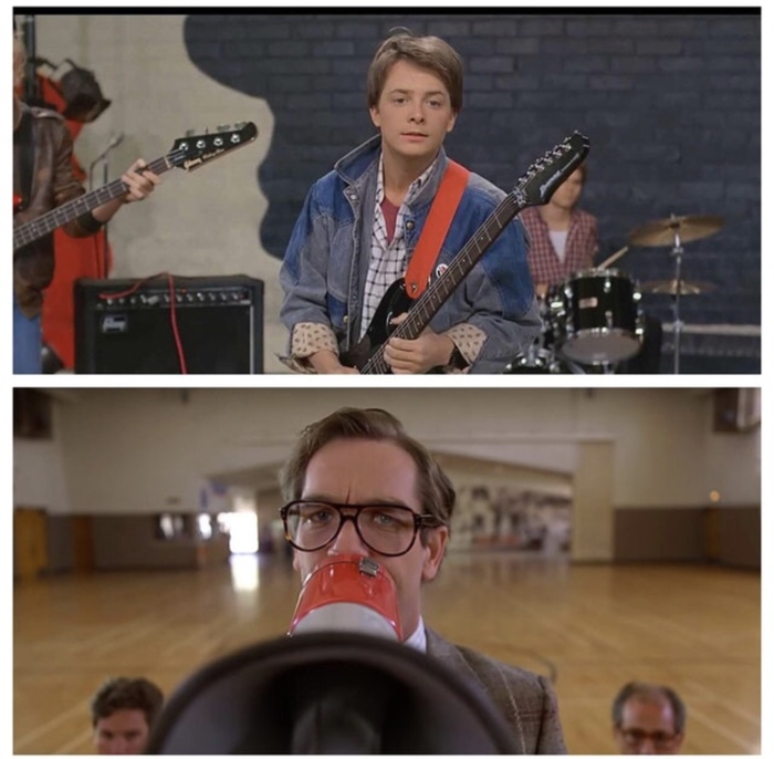 В «Назад в будущее (1985)» когда Марти проходит отборы для школьных танцев, он исполняет песню «Сила любви» музыканта Хью Льюиса.» Член жюри который говорит ему «слишком громко» и есть Хью Льюис.