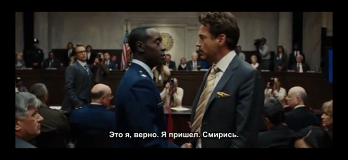 Первая же фраза произнесенная Джеймсом Роудсом в фильме «Железный Человек 2 (2010)» ломает 4-тую стену, и посвящена смене актера играющего роль полковника Роудса.