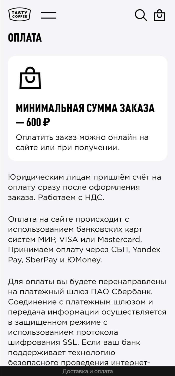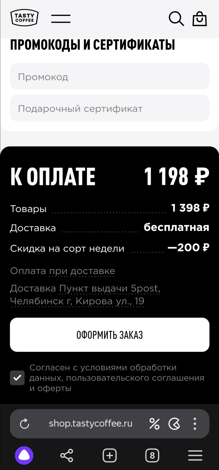 Не первый раз убеждаюсь бесполезности промокодов, различных купонов. В этот раз получил от Т-Банка промокод 500 рублей скидка при заказе от 1000 рублей на сайте Tasty Coffee.