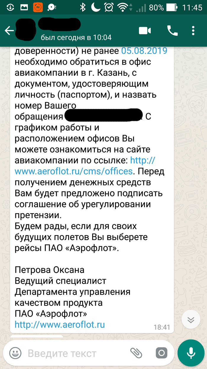 Тогда я написала претензию в Аэрофлот. Они целый месяц рассматривали мою заявку и в результате сотрудник департамента управления качеством продукта ПАО «Аэрофлот», Сергей, ответил мне отказом, ссылаясь на то, что технические причины при отмене рейса являются чрезвычайным обстоятельством и компенсация мне не положена, хотя судебная система Европы считает по-другому, на что я ссылалась в тексте претензии.