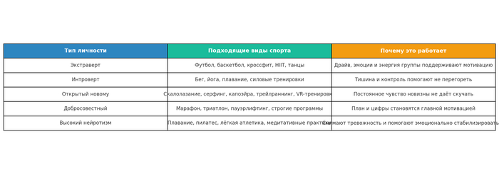 Но исследования показывают: наш характер напрямую влияет на то, какой спорт будет приносить удовольствие и давать результат. Университетский колледж Лондона (UCL) провёл масштабный опрос и выяснил, что экстраверты чаще выбирают групповые высокоинтенсивные тренировки, интроверты — индивидуальные занятия, а люди с высоким уровнем открытости к новому — нестандартные виды спорта, где можно экспериментировать.