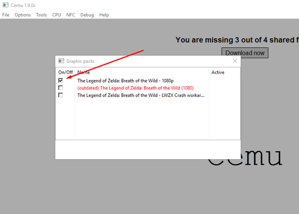 6. Далее, даже во время загрузки можно уже нажать кнопку Options и нажать вот этот пункт в меню (без запуска игры этот пункт неактивен). Это включается тот самый плагин для CEMU (который вроде как помогает эмуляторы быстрее рендерить игровые ресурсы, но это не точно) увеличивающий фпс в игре.