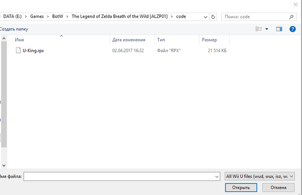 4. Ищем по пути X:\Папка_нейм\BotW\The Legend of Zelda Breath of the Wild [ALZP01]\code файл U-king.rpx и выбираем его для загрузки нажав кнопку "Открыть".