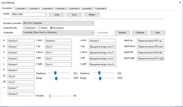 7. Далее, идем в то же меню Options и выбираем Input Settings. Выбираем какой геймпад от WiiU будем эмулировать (я, честно говоря, не представляю в чем их разница) и прожимаем кнопки для соответствия, крутим стики и т.д.
