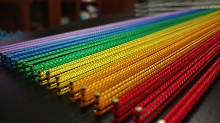 Дело длительное и утомительное – как завязать узел, чтобы не был виден и не развязался, как вести нитку, как закрепить нитку вконце, чтобы всё было натянуто. Долгий процесс… Но продолжаем! Также была производственная травма - при затягивании узла нитка порвалась (все были трехжильними, а зелёная двухжильная), и рука «ушла» в сторону, и, фалангой пальца прямо об шляпку гвоздя, результат – кровища с пальца, но работа должна продолжаться =)