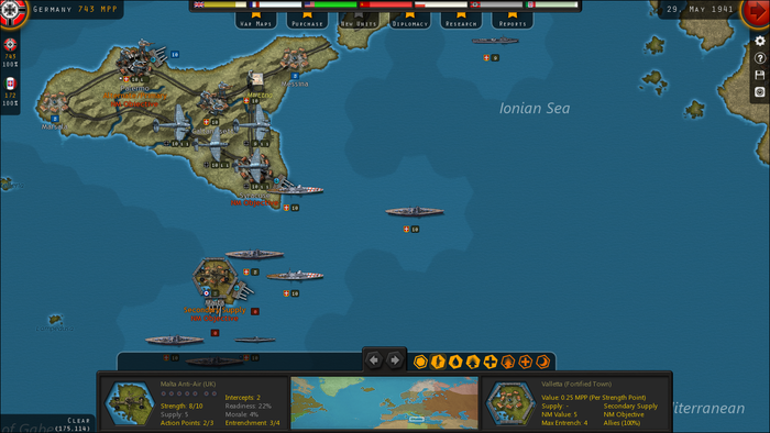 4) Миссия Италии. При вменяемых размеров армии и приличных ВМС экономика южного соседа оставляет желать много лучшего, поэтому развитие выходит очень куцым. Я обычно концентрируюсь на флоте и пехоте, больше ресурсов ни на что не хватает. Кампания в Северной Африке обречена на провал без взятия Мальты, поэтому после получения контроля над Великобританией перекидываем немецкие бомбардировщики на Сицилию. После штурма Мальты при некоторой удаче можно до появления немцев удержать Тобрук и нанести потери британским ВМС – на большее сил, скорее всего, не хватит. Воевать с Грецией смысла нет никакого. После захвата Египта и окончательного уничтожения флота Великобритании в Средиземноморье выводим ВМС Италии в Бискайский залив – они там очень скоро понадобятся. Сухопутная итальянская группировка, действовавшая против Франции, готовится к войне с Югославией.