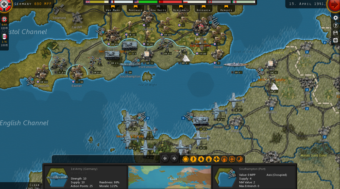 3) «Морской лев». Если вы высаживаетесь в Англии, удостоверьтесь, что а) в первом эшелоне пойдут танки и штаб, б) сразу нацеливайтесь на порт (Портсмут удобнее, Плимут проще), в) несколько месяцев придётся выносить авиацией и флотом ВМС противника (поэтому – никаких рейдерских операций, все надводные и подводные силы должны быть в Ла-Манше). Как правило, к весне флот противника почти полностью уничтожен, и наши части медленно наступают. После первого натиска хорошо работает быстрый удар Бристоль – Бирмингем – Манчестер и далее на север. Если успевать сбивать танками заслоны, можно оперативно занять всю территорию и взять Лондон на обратном пути; если же позволить ИИ укрепляться, застрянешь надолго – удобных для обороны мест на островах пруд пруди, а война с СССР совсем скоро. Обычно на кампанию хватает 14 лучших юнитов и 2 штабов, все остальные можно выдвигать к советской границе. Флот пока развлекается на коммуникациях в Ирландском море.