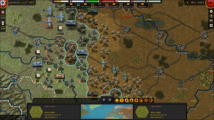 7) Тактика в войне с СССР. Ключ к успеху – быстрый штурм городов, с окружением или без него, восстановление боеспособности, стремительный прыжок к следующему городу. Город+штаб в нём – основа вашей группы юнитов. В самом плохом случае, когда противник плотно утрамбовал местность войсками, уничтожайте хотя бы по 1-2 юнита за ход, ищите пути окружения всей группировки и отрезайте противника от городов и штабов. Ленинград и (особенно) Москву придётся окружать и прогрызать, Сталинград удалось взять сходу, но это скорее везение.