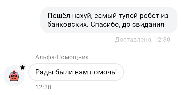 8 Hacnop Ни на один мой вопрос не может ответить 3 года назад Альфа-Банк Чат-бот Бот Мат Служба поддержки Странный юмор Ещё 0