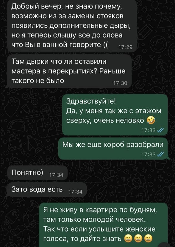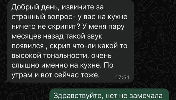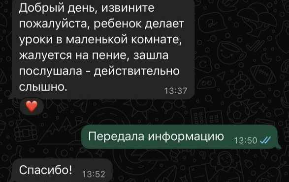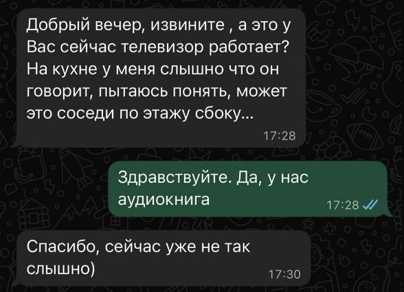 Но соседка пишет каждый раз, если она дома и как только услышит звук. И пишет она не мне, а жене, хотя мои контакты у нее есть и она знает, что источник звука - не жена. И, кстати, не только по поводу музыки - пылесос, телевизор, Алиса что-нибудь играет, она тоже считает достаточным поводом, чтобы сообщить о своем дискомфорте.