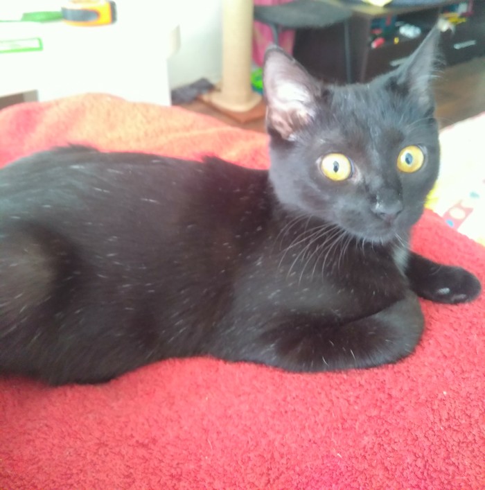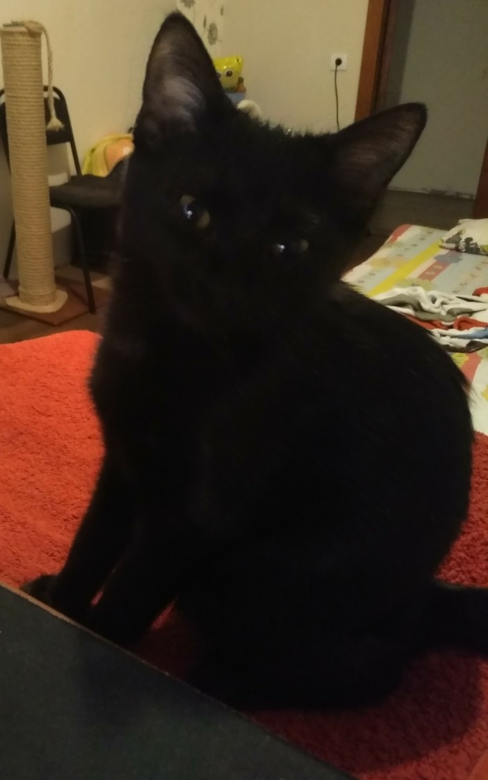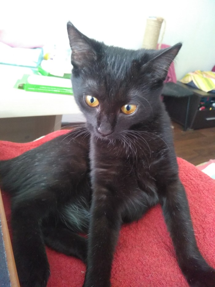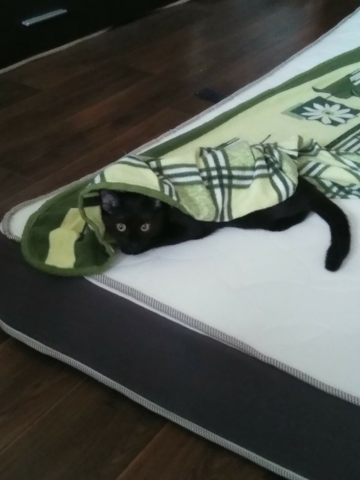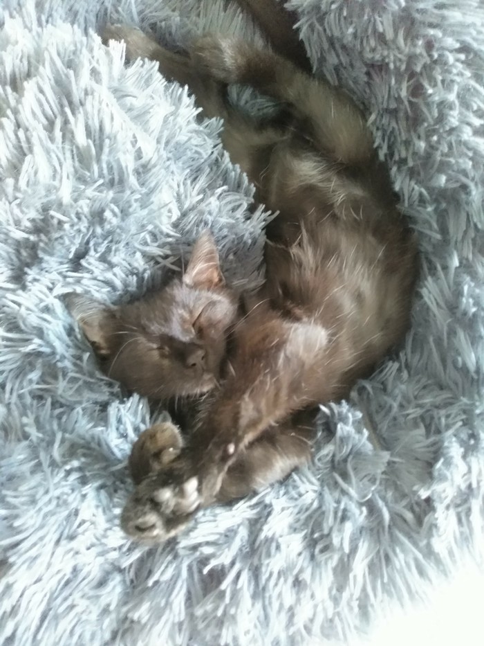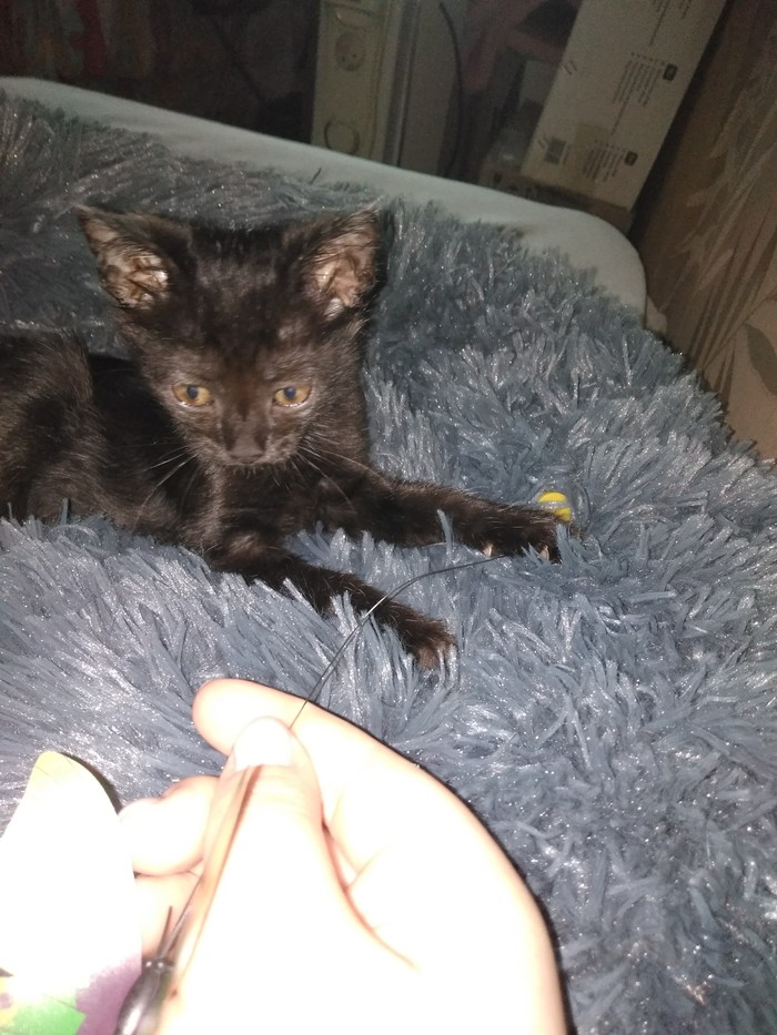 На тот момент, когда мы ее взяли, ей был месяц. Маленький, испуганный котенок. Я около 2,5 недель жила с ней в отдельной комнате, карантин, все дела. А потом она начала болеть. Почти сразу я заметила у нее какие-то корочки по телу. На хвосте, на спине, везде. Она начала ходить в туалет кровью.