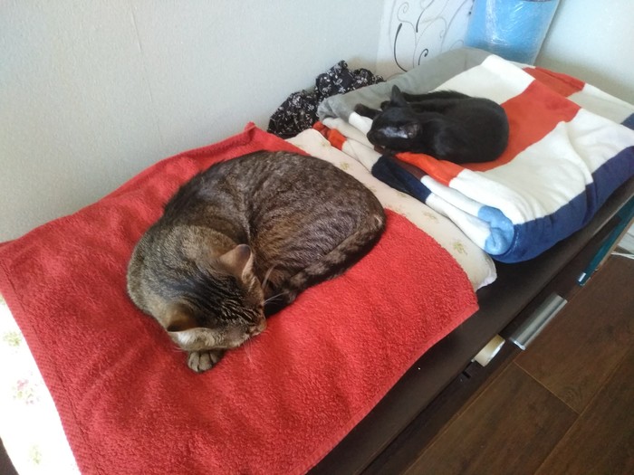 Спустя три недели эти две лошадки уже гоняют по квартире вместе. Правда, Пуся у нас мадам особенная, все вот эти ласки и игры с тесным контактом она не любит, из-за чего мелкая часто получает лапой. Вообще, старшая начала Соню воспитывать - когда та прыгает и кусает за уши, Пуська может шикнуть на нее и дать по голове Если сильно - то мы, конечно ругаем. А так вроде уже немного привыкли друг к другу, а на фото - первый момент, когда мелочь легла относительно рядом, а Пуся от этого не убежала в другую комнату))