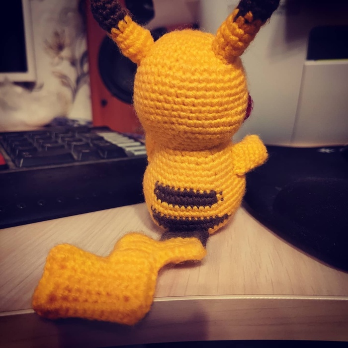 Подсадила дочку на Покемонов. И она, закономерно, стала просить игрушки с любимым Пикачу. Оказалось, что в наше время найти их сложно и стоят они весьма прилично. Потому было решено Пикачу связать. Схемы, которые понравились, были только в платном доступе, а бесплатные как-то не зашли, так что разрабатывать схему пришлось самостоятельно. Вот такой получился подарок для маленького тренера покемонов :)
