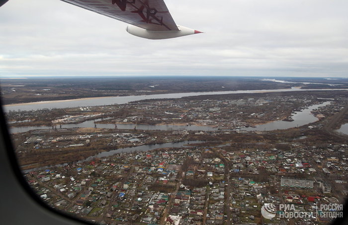 Вид из иллюминатора самолета Л-410 на город Котлас. © РИА Новости / Вера Костамо