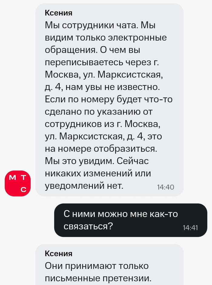 Для МТС решение проблемы в прямом смысле «гроша выеденного не стоило бы»: убрать мой адрес из чужих договоров (это был не первый случай), оформить платёжку на 1 рубль и (внимание!) отправить в течение 30 дней письменный ответ на мою досудебную претензию. По готовым шаблонам документов это у МТС заняло бы минут 10-15; а с привлечением ИИ – за пару секунд.