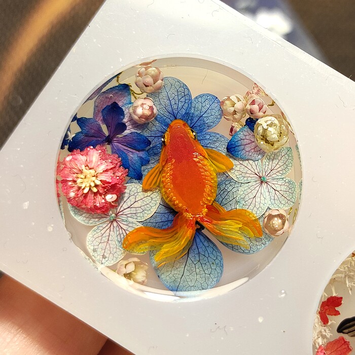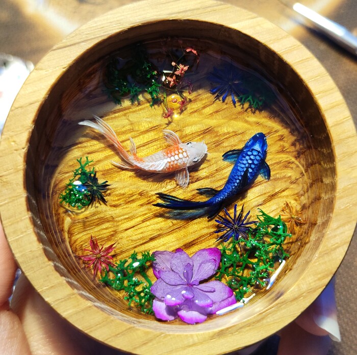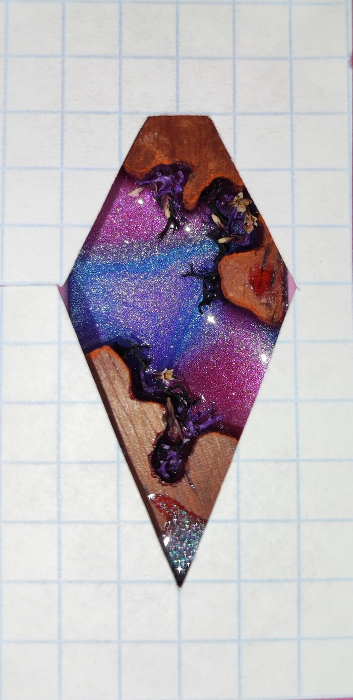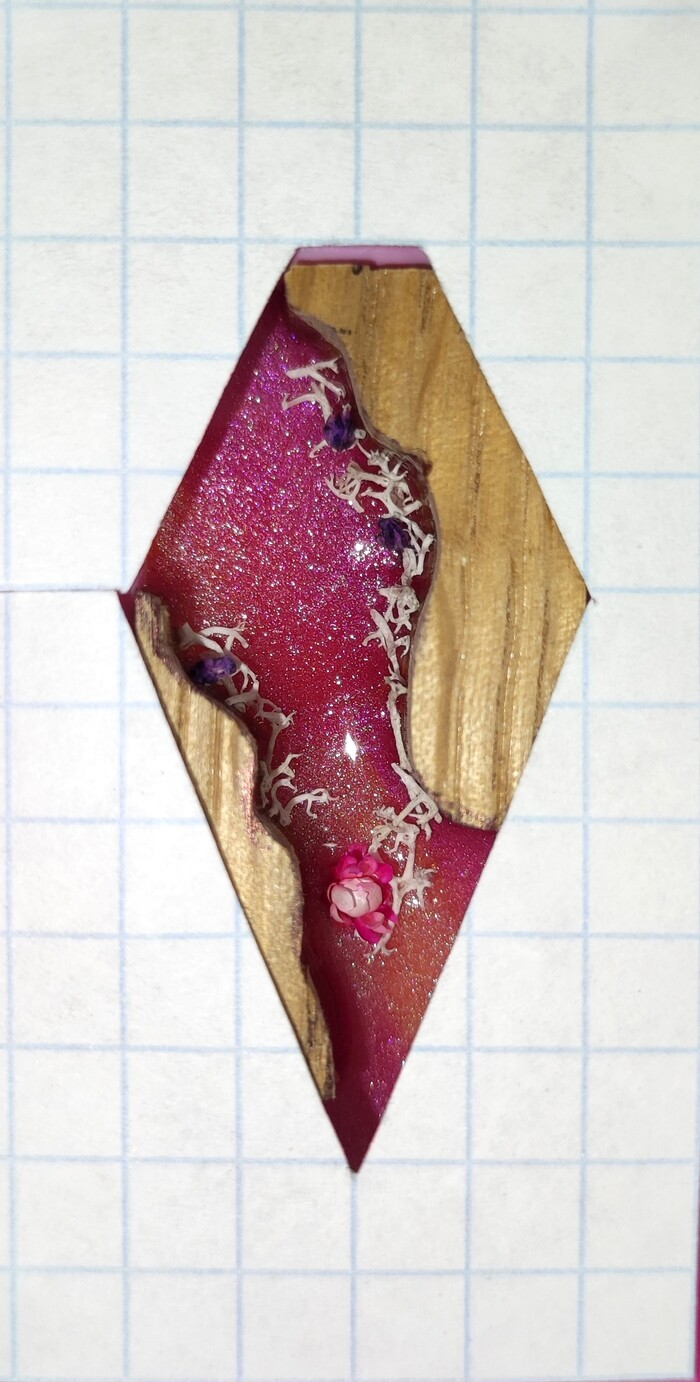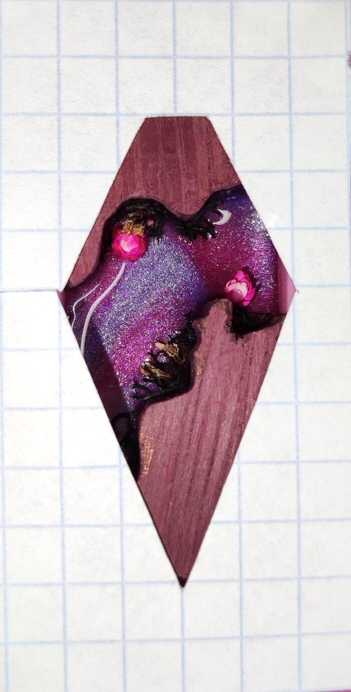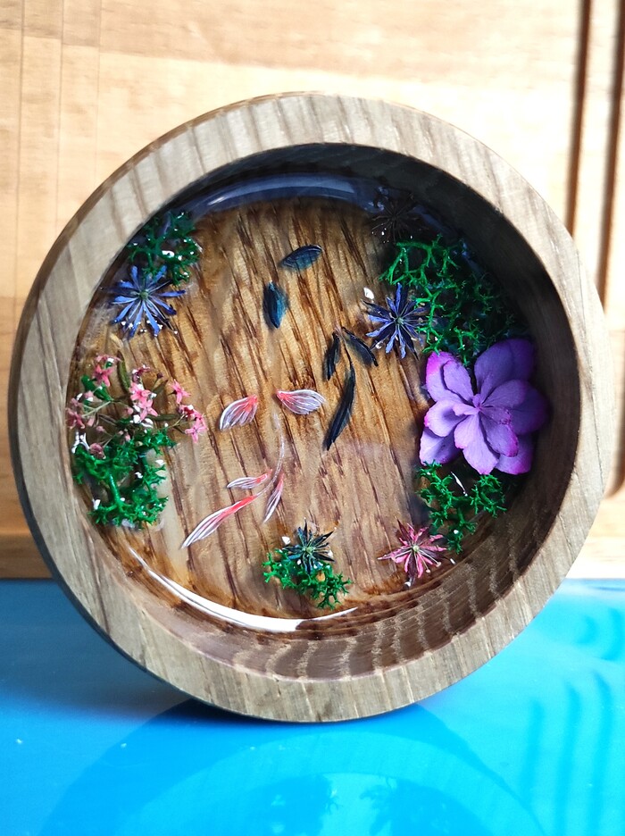 Далее деревянные заготовки помещаю в прямоугольные формы, создаю фон из эпоксидной смолы с перламутровыми пигментами и композицию из сухоцветов.