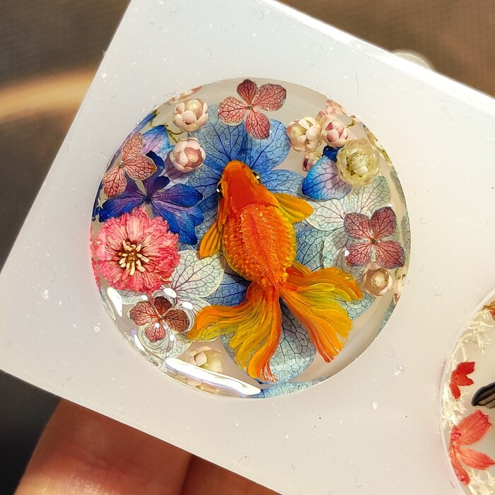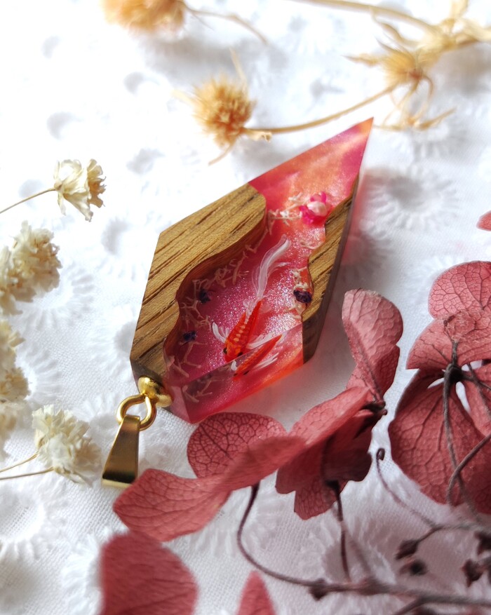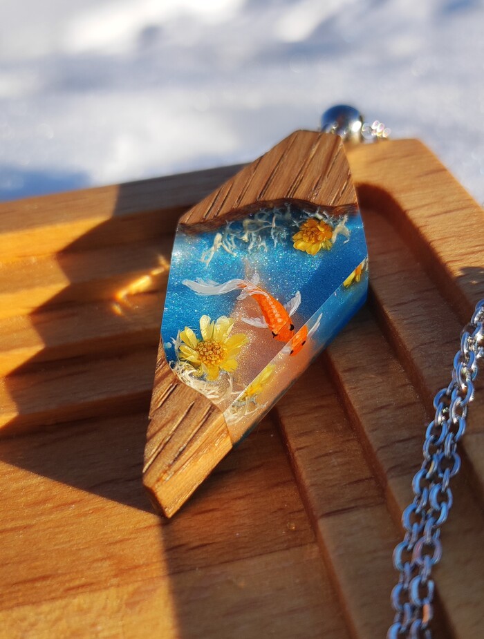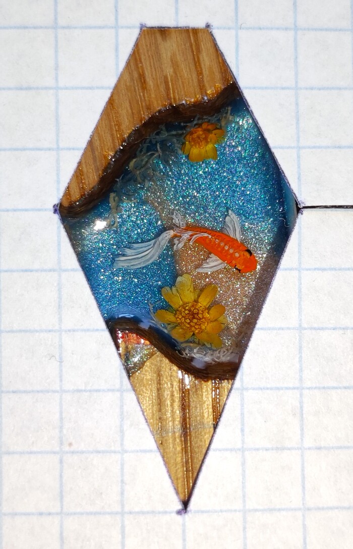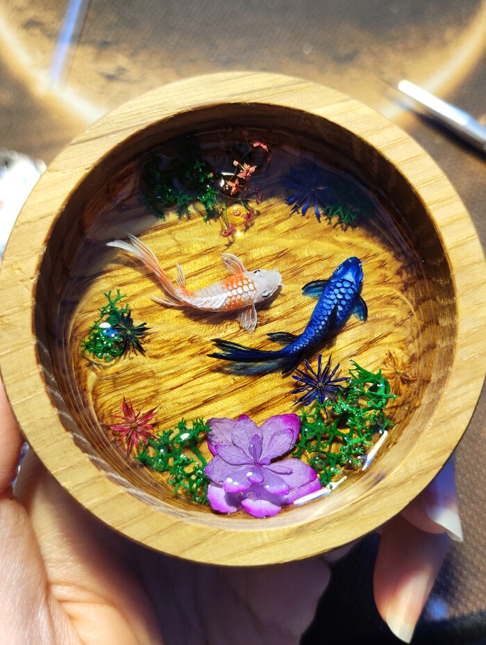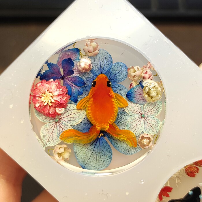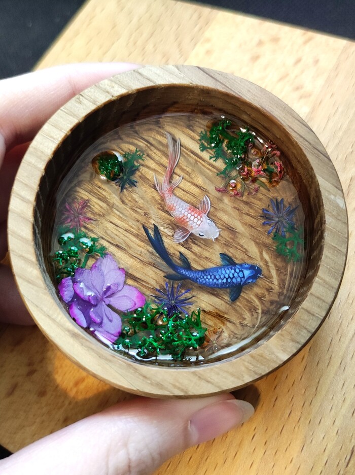 Далее деревянные заготовки помещаю в прямоугольные формы, создаю фон из эпоксидной смолы с перламутровыми пигментами и композицию из сухоцветов.