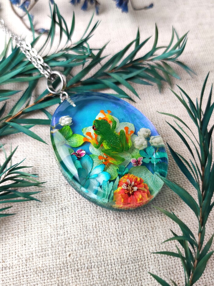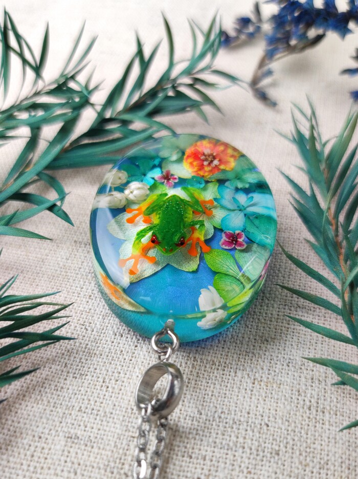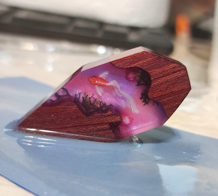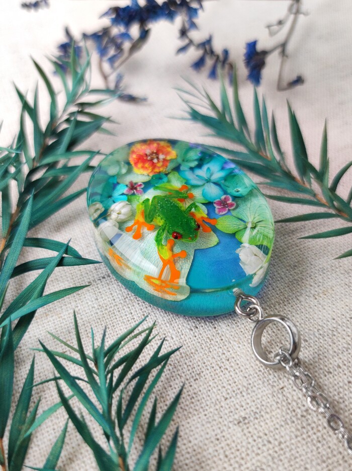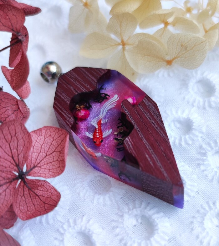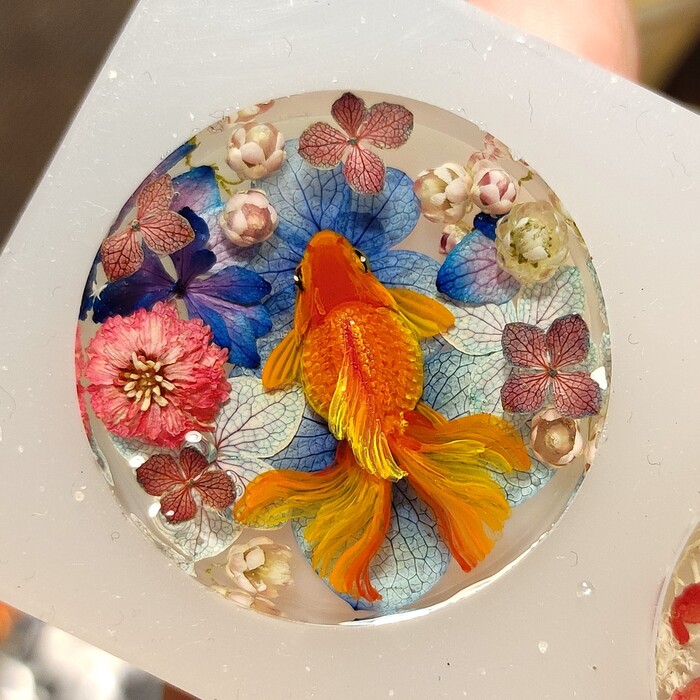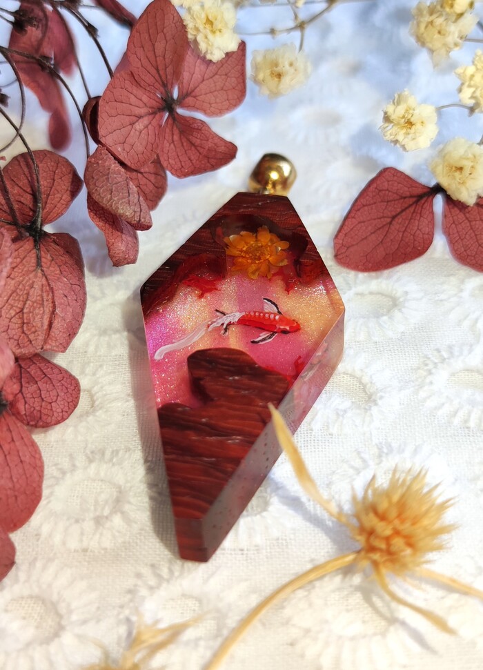 Далее деревянные заготовки помещаю в прямоугольные формы, создаю фон из эпоксидной смолы с перламутровыми пигментами и композицию из сухоцветов.