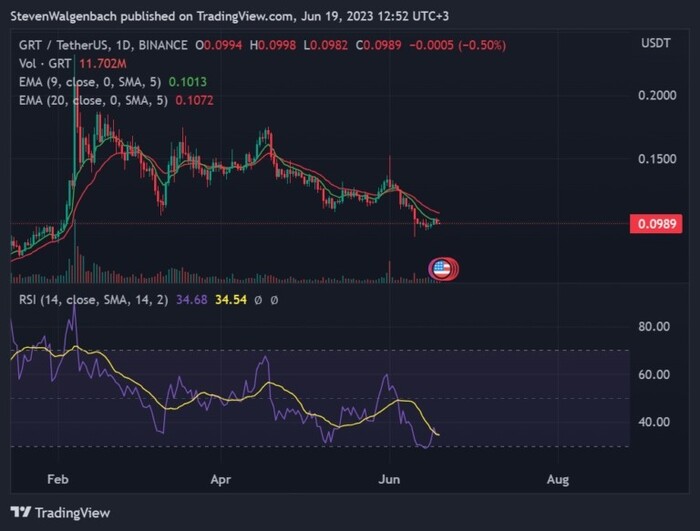 Как и большинство криптотокенов на рынке, в начале недели GRT понёс убытки. На текущий момент токен торгуется по $ 0,09884 с дневными потерями более 2%. Недельные показатели GRT оказались в красной зоне с цифрой -0,39%.