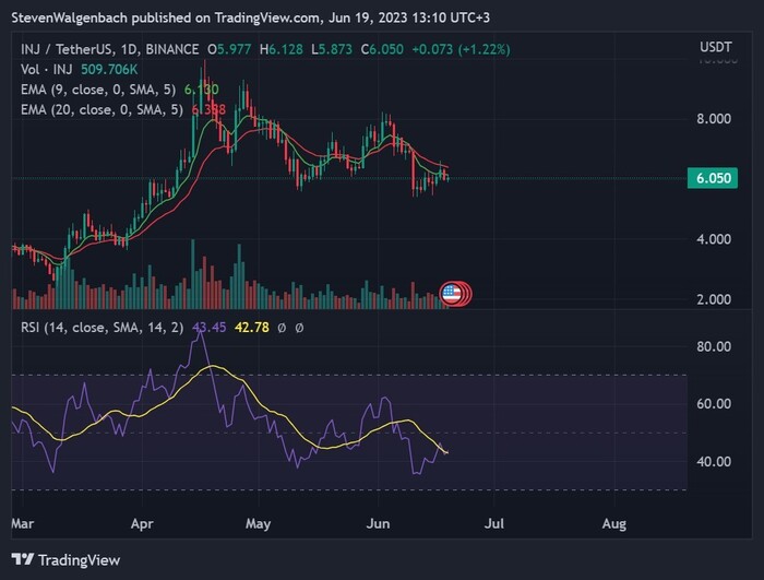 Недавно на дневном графике INJ сформировался заметный медвежий флаг, поскольку за последние 48 часов дневная линия RSI пересекла дневную линию RSI SMA. Если этот медвежий флаг подтвердится, на следующей неделе цена альткоина может упасть до $ 5.