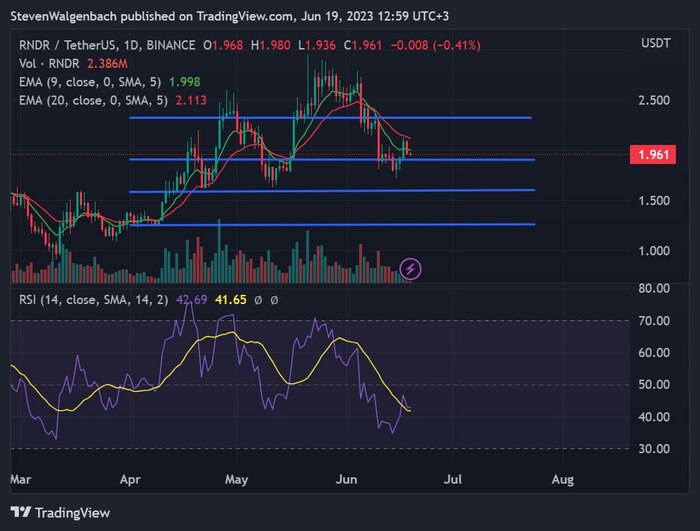 Текущая цена RNDR находится на уровне поддержки $ 1,906, пробившись выше 9-дневной линии EMA за последние 48 часов, что привело к тому, что цена альткоина упала до недельного минимума в $ 1,722. Вчера давление медведей на продажу было слишком сильным для быков, в результате чего цена RNDR закрылась ниже линии EMA.